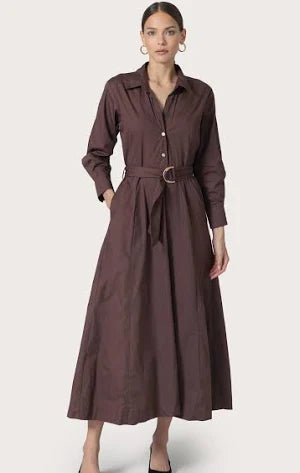 Long sleeve button-through shirt dress. Side pockets. D-ring belt closure. Full skirt maxi. Lined back panel. Front placket.