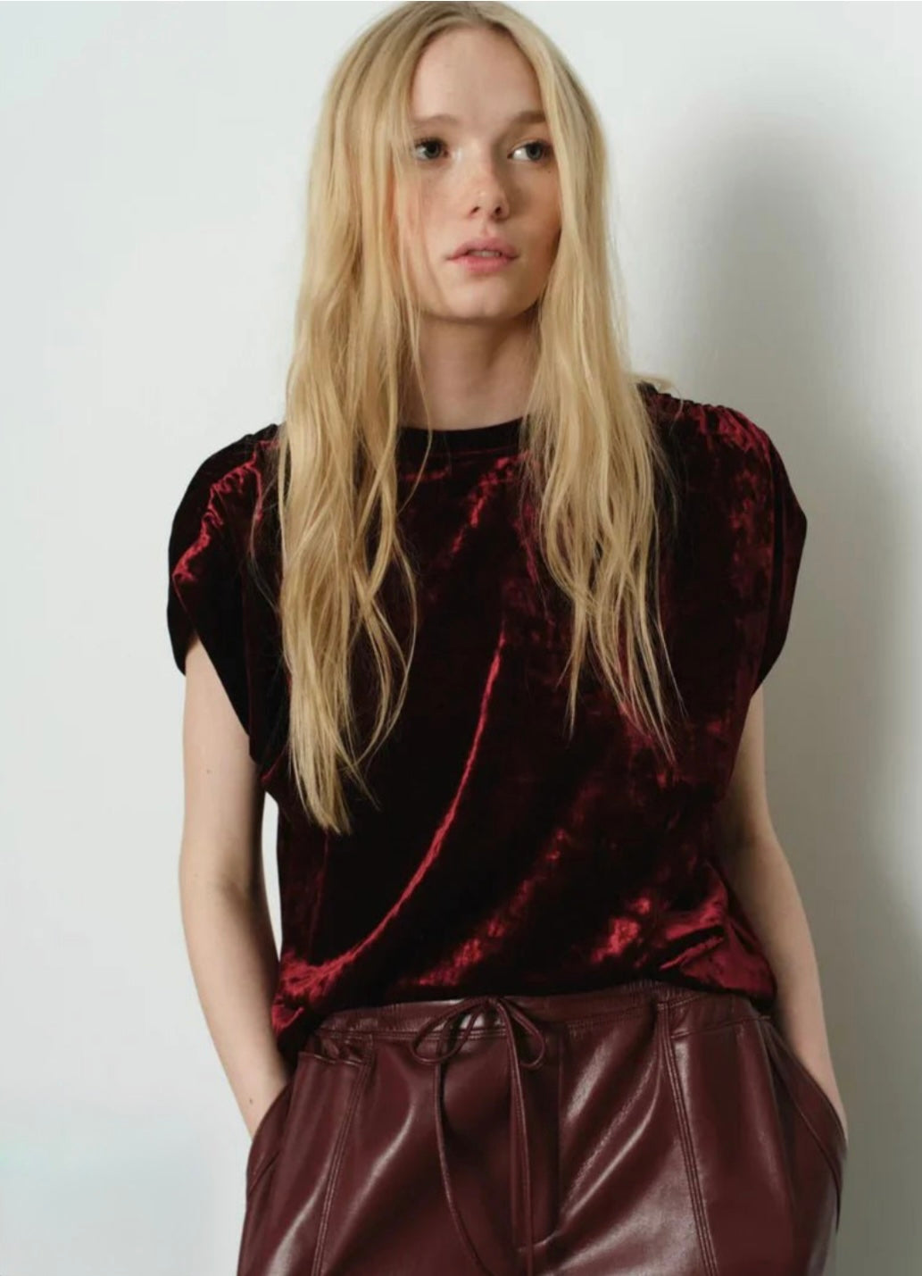 Embrace effortless elegance with the Melissa Nepton Tage Top—a sleeveless velvet top that seamlessly blends coziness and chicness. The luxurious fabric drapes elegantly against your skin, transforming you into a sophisticated silhouette that effortlessly transitions from brunch to evening plans.