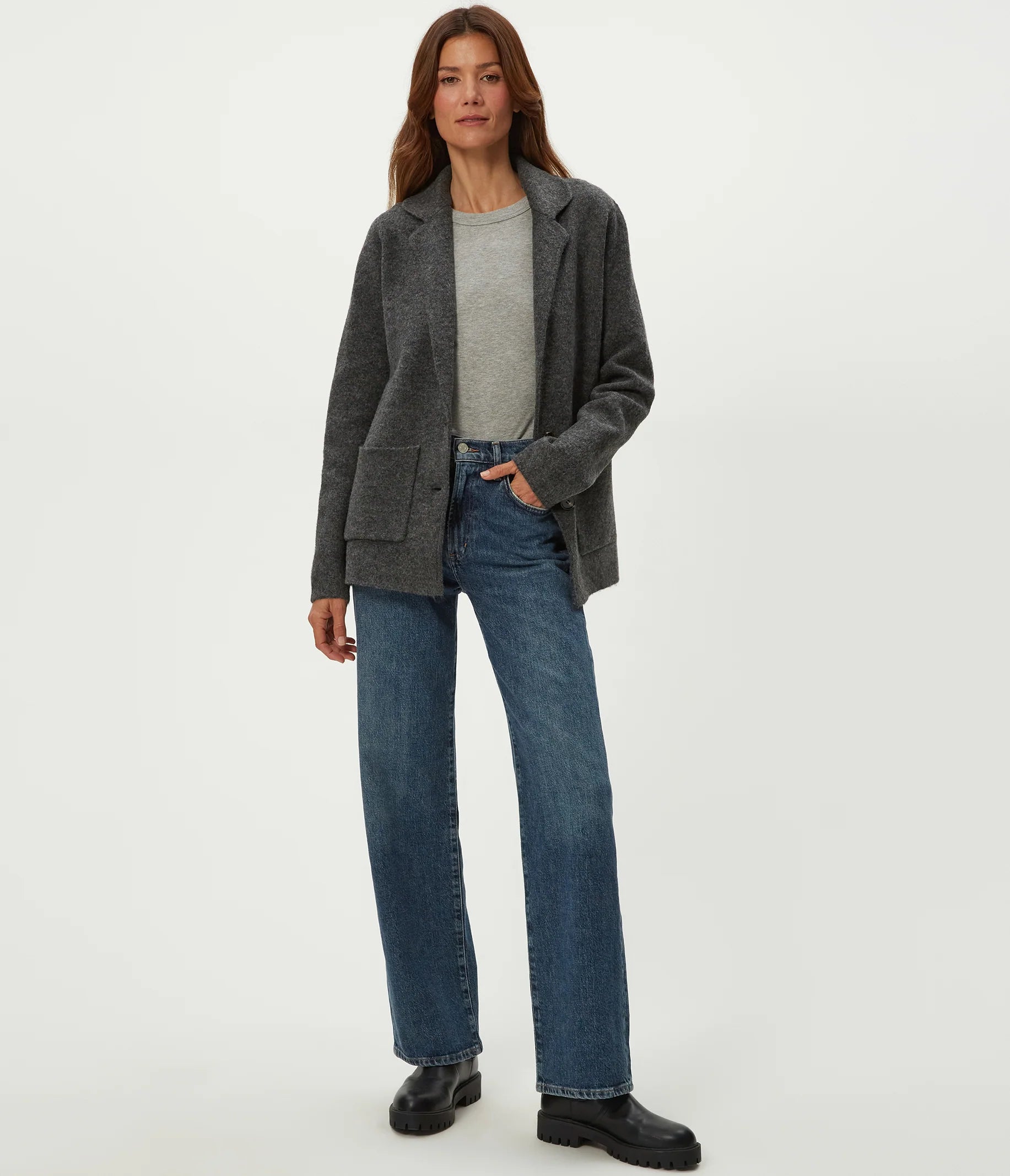 A cool-weather must have, the Diana blazer from Michael Stars is a compact, semi-fitted knit blazer with patch pockets and a notched collar.
