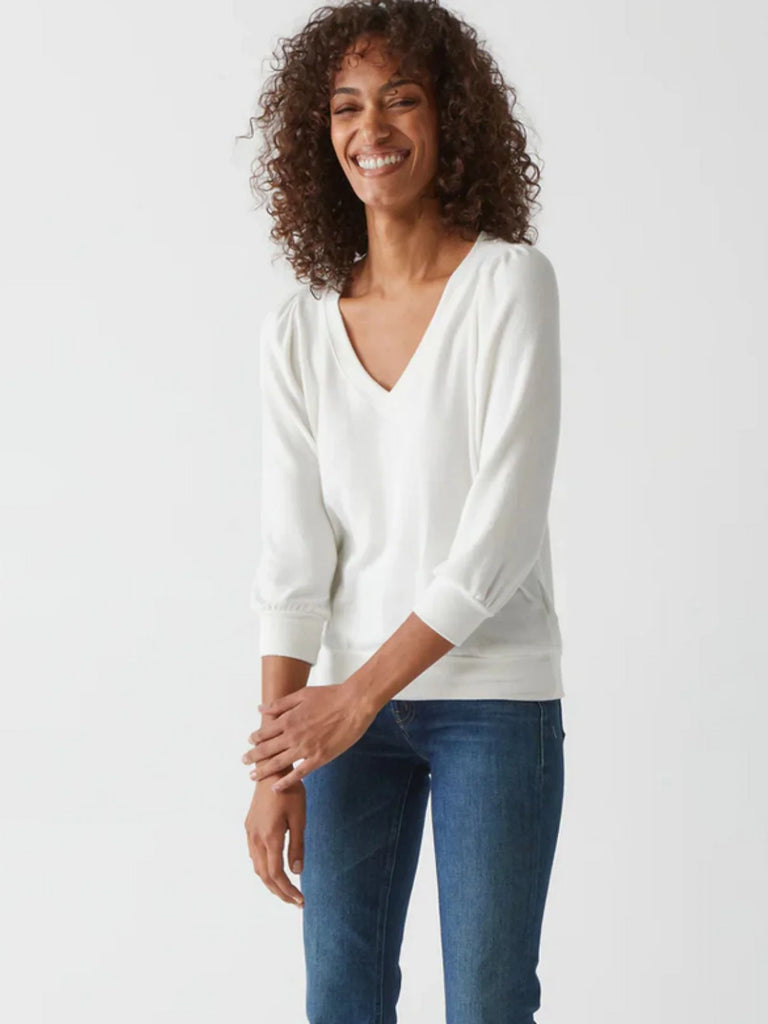 When the forecast calls for lightweight layers, opt for this top. Crafted in our incredibly soft Madison Brushed fabrication, this essential top features a deep v-neckline, slightly puffed ¾ sleeves, and ribbing at the cuff and hem.