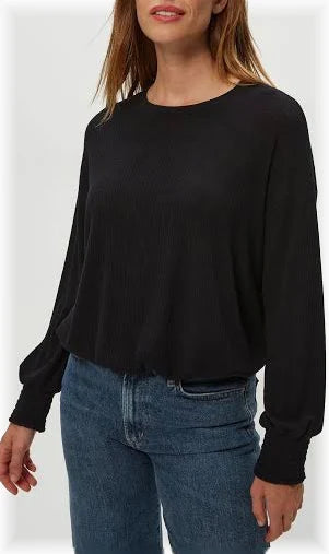 Tia is the top that’ll you’ll get excited to wear. With a crew neckline, long sleeves with smocking at the cuffs and a cozy ribbed body, Tia offers a more elevated feel. It features bubble hem with an easy fit making this perfect for pairing back your favorite denim or the Avery Cargo Pant.
