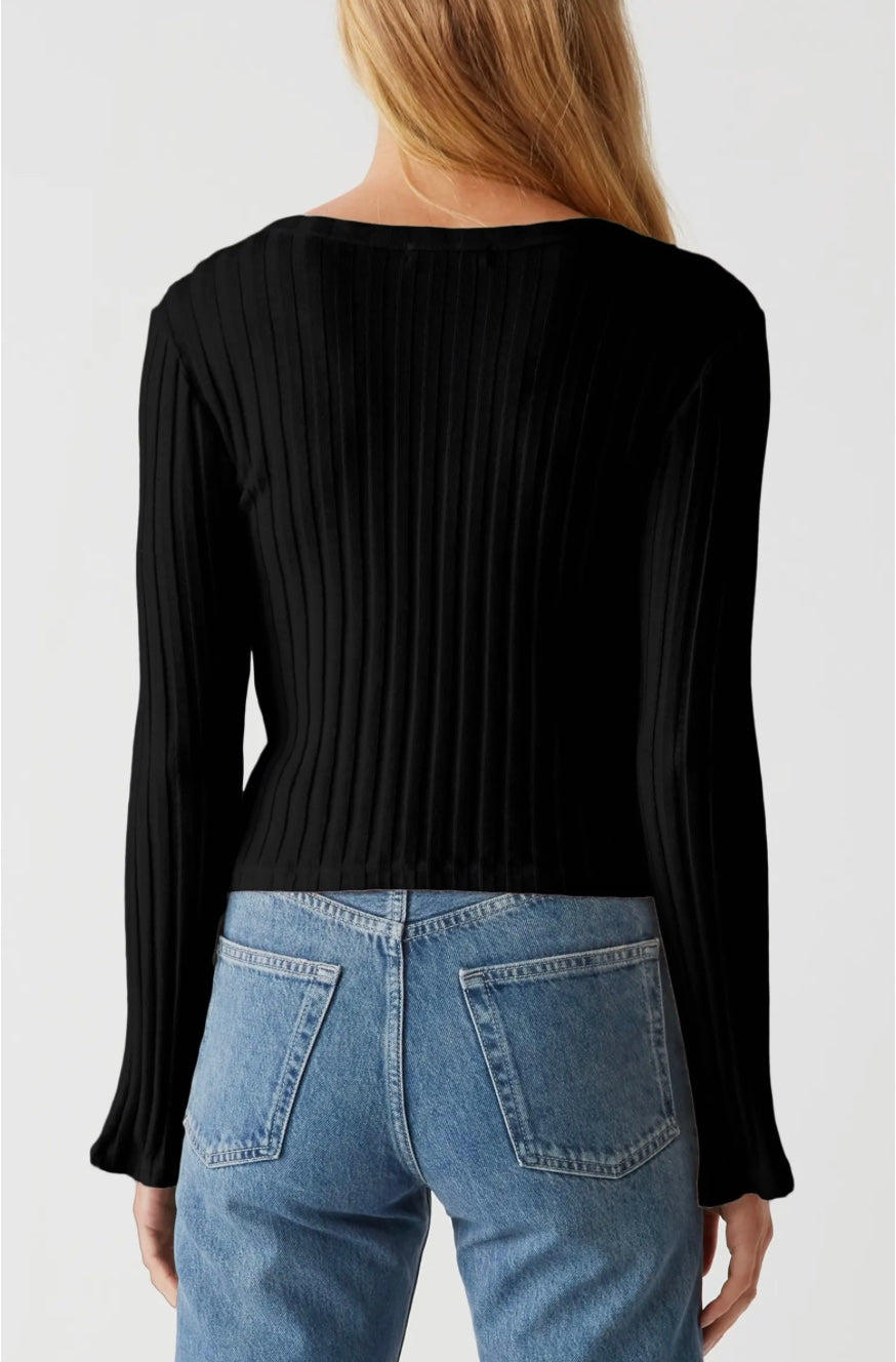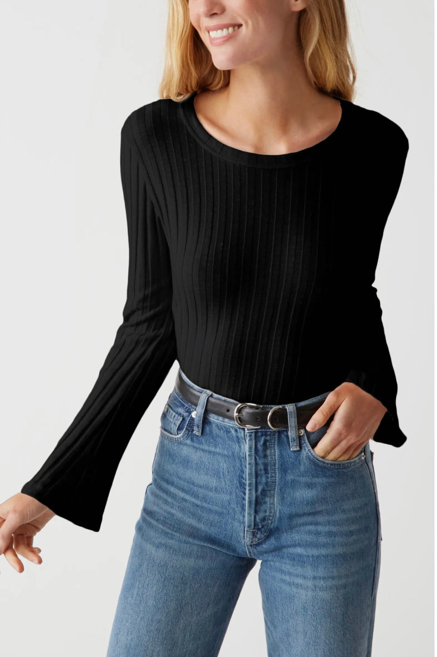This chic Valerie ribbed top from Michael Stars features a wide crew neckline and long, fitted bell sleeves. Crafted from exquisite knit fabric, the body has a close fit that’s perfect for layering. Wear it with denim or tailoring.