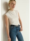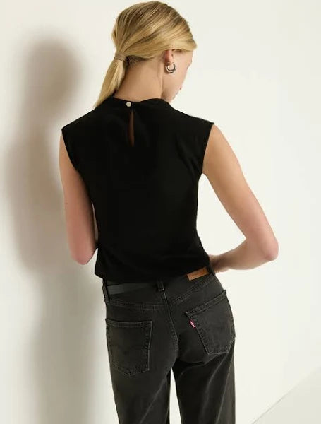 Minimal, structured, and elegantly feminine, this sleeveless mock neck tank has a clean silhouette, a subtle draping, and a button closure. This one comes in Jet Black.