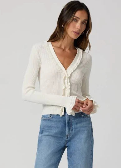 Made from a luxurious Eco Peachskin fabric, this chic antique white cardigan from Paige is designed with delicate ruffles down the V-neckline and front button placket, along with ruffled cuff details. The variegated rib placements add texture, making it a versatile piece perfect for layering over a dress of wearing as a top.