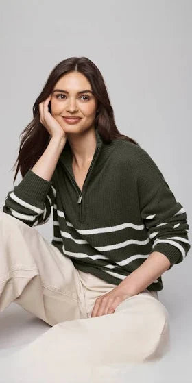 A classic stripe, reimagined for cozy days. The Georgie Stripe Quarter Zip Sweater is made from a soft, midweight knit with a relaxed fit and sporty zip-up collar. The contrast stripes and ribbed trim keep it timeless, while the drop shoulders and slightly boxy shape make it effortlessly modern. Zip it up or wear it open-it's the easiest way to elevate your casual layers.