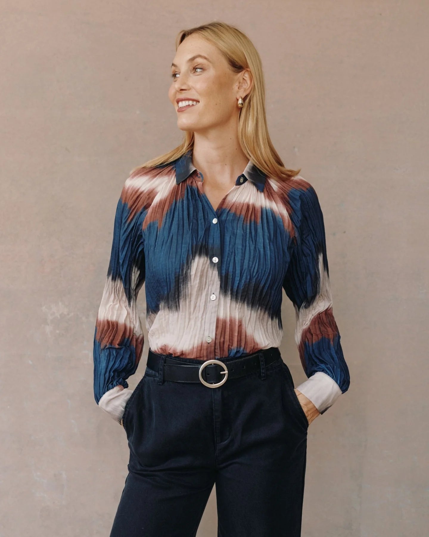 Lightweight and polished, the Pleated Raglan Sleeve Shirt in Midnight Tides Print brings an elevated, painterly touch to everyday layering.