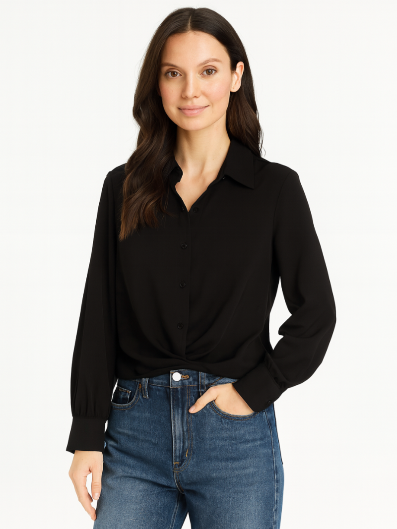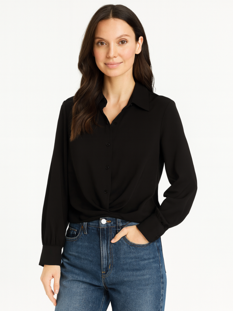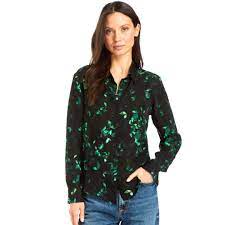 Elevate your look with this elegant satin blouse featuring a subtle floral print on a rich black base. Its silky texture and tailored silhouette make it perfect for both workdays and evenings out. A polished piece with timeless appeal.