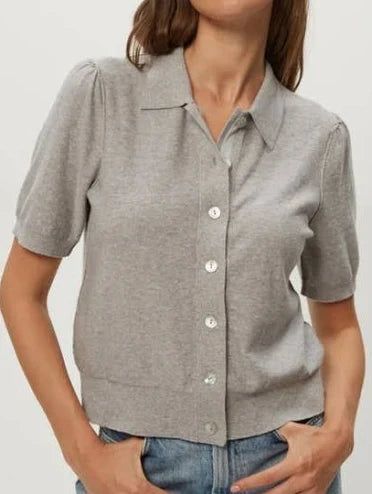 This soft basic is anything but boring. Featuring a classic collared neckline, button-front closure, a relaxed fit with ribbed detailing at the hem, puffed short sleeves, and a slightly cropped length, all finished in a buttery cashmere blend. Pair with slacks, shorts, and blazers this spring!