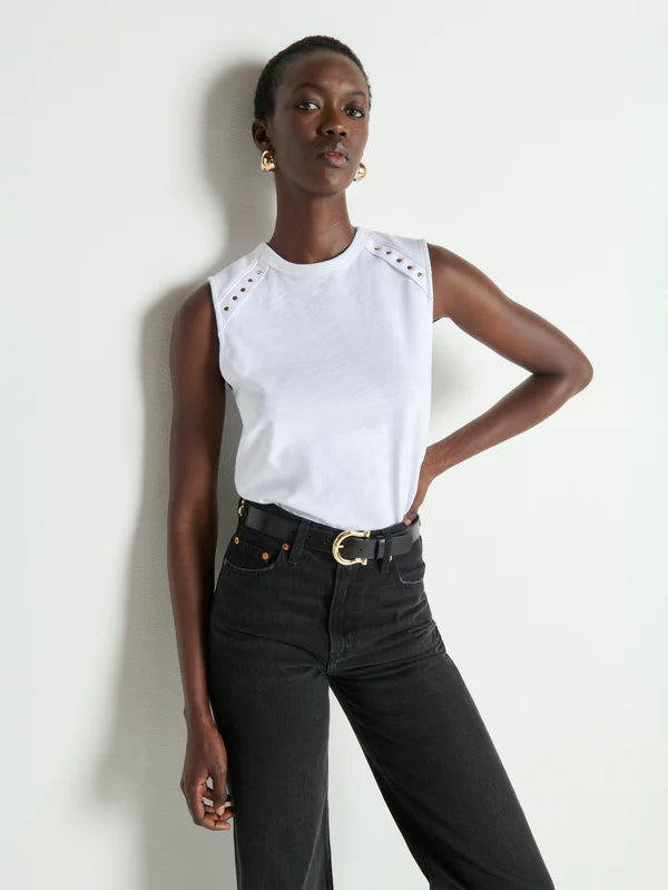 A subtle twist on a classic tank. The Davina is a sleeveless crew neck top made from 100% cotton jersey in our classic fit and finished with gold snaps.