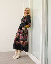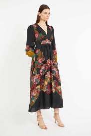 Crafted in our Lacquer Bush Lily print, a black background with stylized lilies in warm rust, coral, cream, and burgundy, balanced with deep teal and olive. Decorative borders and blouson sleeves complete the look, perfect for special occasions or evening events.