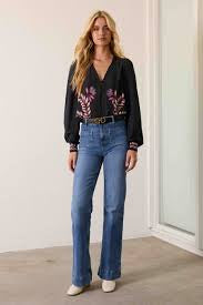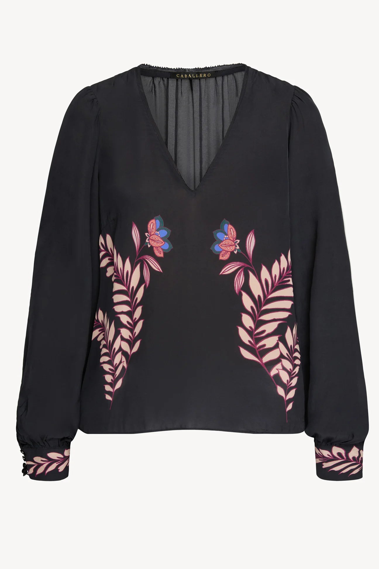 The Ruby Top is a long-sleeve blouse crafted from 100% viscose, offering a soft drape and effortless comfort. Blouson sleeves with buttoned cuffs add a touch of tailored detail to the flowing silhouette, while a flattering V-neckline and gentle shirring at the back neck enhance its relaxed fit.