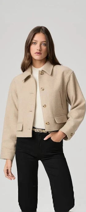 The Alfie Jacket is our lightweight, single-breasted cropped jacket crafted from a soft and structured 100% wool in a heathered light taupe brown. Designed with a boxy fit, this layer features double welt and flap pockets, slash welt pockets, and refined horn buttons for a timeless finish.