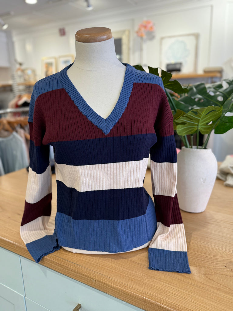 This ribbed v neck fitted sweater from Red Haute comes in a unique striped color combination of deep burgundy, navy, ivory and blue. Pair it with your favorite denim. You will live in this top all season long!!